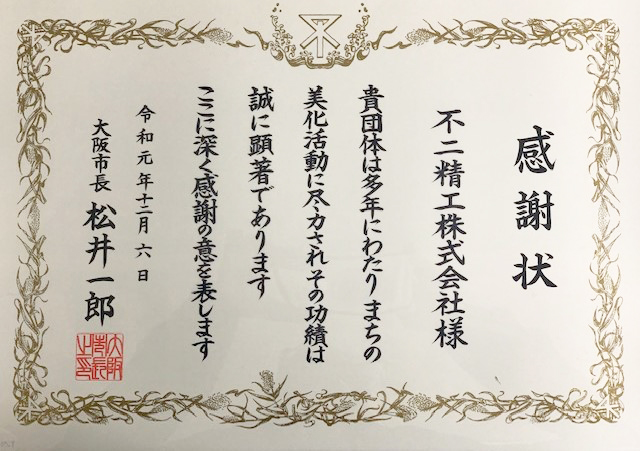 大阪市西淀川区の美化運動功労者表彰として、松井市長より表彰状を頂きました!